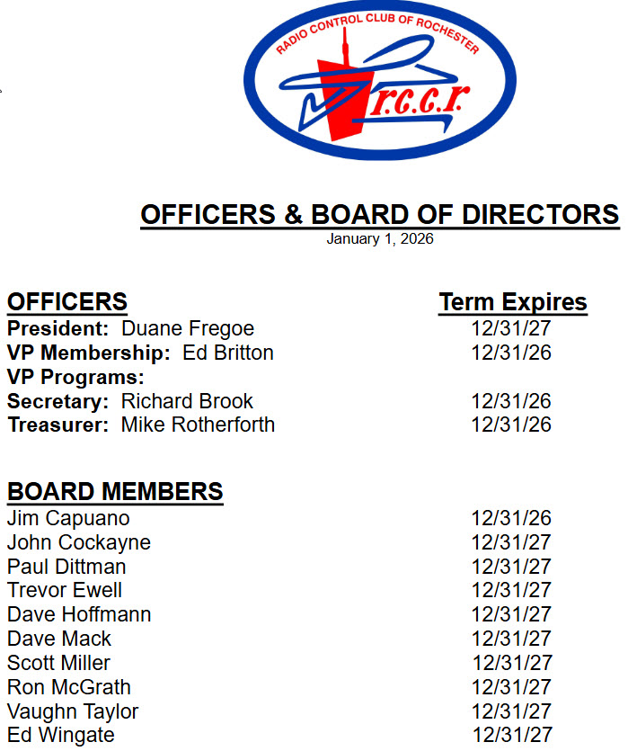 ![]() RCCR President Duane Fregoe State of the RCCR 2025 This was my second year as president of the club. The start of the year was the New Year’s Day Chilly Chili Fun Fly at Hasman Field. We had four pots of chili and 17 people in attendance. Conditions were wet and breezy. Only two brave pilots took to the sky. Again I sent info on our event to the AMA and was mentioned in the AMA blog on New Year’s Day events. The officer positions for Secretary, Treasurer, and VP of Membership will stay the same for another two years following the December 2024 elections. VP of programs was not filled this year. I also started a list of past presidents. Still missing many names for the 70’s and 80’s along with 1957 – 1959. Tried to get the Real Flight multiplayer sessions started again on Wednesday evenings but it never took off. Indoor flying at the Terry Taylor School did take off and continued through the winter on Friday evenings from 6:00 – 9:00 pm. The annual roast was held at Pinewood Country Club on February 8th.Cheryl Wingate took care of the raffle prizes for the women as she has done for many years now. Ed Britton was Man of the Year and the Broken Prop Award has been hidden in a steel vault. Mike Rotherforthagain took the lead on the annual Brighton High School Festival of Ideas that took place on March 1st. Several club members helped the day of the event to make it a success. We had 4 simulator stations set up and kids flying with the buddy-box. The club Bylaws that took about a year to update and complete after comments and suggestions from members were finally approved this year. Dave Mack got the funding approval to build 4 new flight stands for Northampton Park. Dave had one fully assembled and the pieces cut for 3 more stands. Some members came over on a Saturday morning with screw guns in hand to help assemble the last 3. Dave later stained them and delivered to the park. They look wonderful and were enjoyed by many. The RCCR Indoor Swap Meet returned this year and was held on February 15th. Jim Gommenginger led the charge and it was held at the North Greece Firemen’s Field Party Hall. The event was a success for its first time back after many years. Tuesday night training began in May again. The electric trainer plane was busy this summer. Dave Hoffmann converted a new donated plane to electric and it looked great. Mike Rotherforth was a regular with his planes that are set up on a buddy-box when things got busy. I also have two planes that are setup for buddy-box operation when needed. Training night is only successful because of our members that donate the time to train others. The Suburban New ran our training announcement all summer. We were also listed in the Kids Out And About website and Beyond the Nest website. I did not try to set up a Heli/Multi-Rotor night this year but it is good to see more people trying helicopters and watching people improve their skills. A new pin board was installed by Ed Britton this year so pilots can display their AMA cards. Pins were eliminated since most everyone is flying 2.4GHz. The new board looks good. The club purchased decals and iron-on patches of the club logo for member to purchase. A website was also setup for members to purchase clothing items with the club logo. After many years of endless potholes on Loop Road the County hired a contractor to do a complete repair of Loop Road. Access to the Northampton Field was so much smoother this year. The Ray Edmund’s Memorial Fun Fly was held on June 28th and 29th.This year’s weather was an improvement over last year. 55 pilots signed in this year. Scott Miller was the CD for this event.A new PA system and wireless microphones were purchased and worked well. The Northampton Field and the Hasman Field were in great shape throughout the flying season. Many thanks to the mowing crews at both sites for their time and dedication to keep the fields in such great shape.No corn was planted again this year at Hasman. The Hal deBolt In-Memorium Fly-In was replaced this year by the Vintage & WW1 Fun Fly at Northampton Park. This event took place on August 16th and turn-out was okay for a first time event. There will be a 2026 event the first weekend in August. On September 20th we had the end of season club picnic at Northampton Park. It was a nice day for flying and eating. Around 35 people were in attendance. The club provided hot dogs, sausage, chips, soda, plates, and plasticware. Members brought in salads and deserts. This year we unfortunately had two members pass away. They were Esteban Bachiller and Jerry Joseph. 2024 ended with 84paying members. This is reduced from the 90 quoted in last year’s report as there were 6 honorary members. 2025 will end with 83 members and 5 honorary members. ![]() RCCR President Duane Fregoe State of the RCCR 2024 This was my first year as president of the club and the first order of business was to get some chili back into the annual New Year’s Day Chilly Chili Fun Fly.Sixteen people got to enjoy four delicious pots of chili along with other tasty treats. With a light dusting of snow and no wind, flying conditions were perfect for large tires and floats. I sent the AMA information on our event and RCCR was mentioned in the AMA blog featuring New Year’s Day flying events around the country. The next order of business was to have a meeting with the officers and board of directors to review the current status of the club. We needed a written record of the current term expiration dates for each officer and board member. We also discussed the distribution of the meeting minutes, bringing back the sign-in sheet at each meeting, helicopter/multi-rotor night, end of summer picnic, updating the club brochure, a monthly activities calendar noting items the club must do throughout the year, and an update to the 2010 Bylaws. Indoor flying at the Terry Taylor School continued through the winter on Friday evenings from 6:00 – 9:00 pm. The annual ro